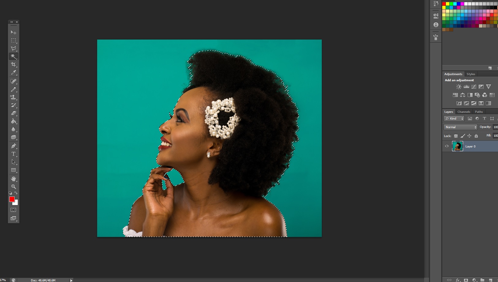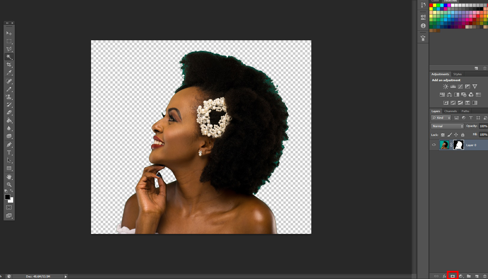 선택이 활성화 된 상태에서 레이어 패널에서 레이어 마스크 추가 버튼을 클릭합니다. 레이어 마스크에는 선택 항목 (피사체)이있는 흰색과 선택 항목이없는 검은 색 (배경)이 있습니다. 검은 색은 선택되지 않은 영역을 숨 깁니다.
