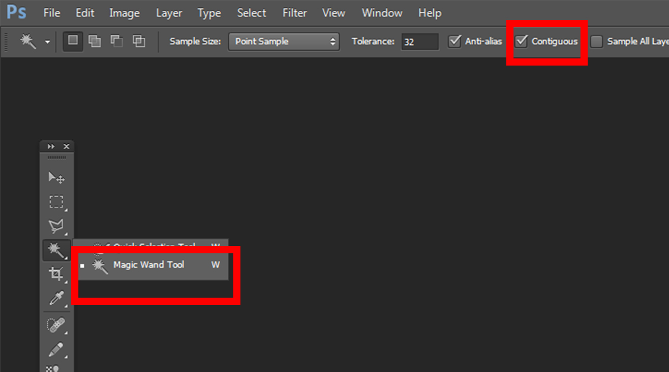 1. 도구 모음에서 마술봉 (Magic Wand) 도구를 선택하고 옵션 막대에서 Contiguous를 선택합니다.