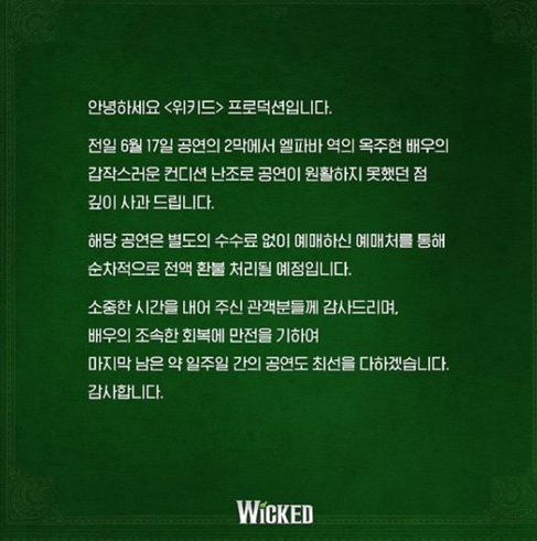 뮤지컬 '위키드'에 출연중인 배우 옥주현의 컨디션 난조로