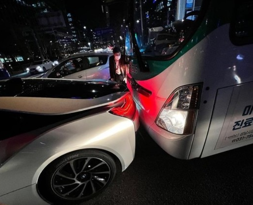 팝핀현준의 슈퍼카 후미를 버스가 들이받은 모습인데요