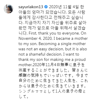2020년 11월 4일 한 아들의 엄마가 되었습니다. 모든 사람들에게 감사한다고 전해주고 싶습니다. 지금까지 자기 자신을 위주로 살아왔던 제가 앞으로 아들 위해서 살겠습니다. First, thank you to everyone. On November 4, 2020, I became a mother to my son. Becoming a single mother was not an easy decision, but it is also not a shameful decision. I want to thank my son for making me a proud mother.2020年11月4日無事に息子を出産することができました。皆さんに感謝の気持ちでいっぱいです。今まで自分のために生きてきた人生を、これからは息子のために生きていきます。シングルママとして1人の息子の母として。