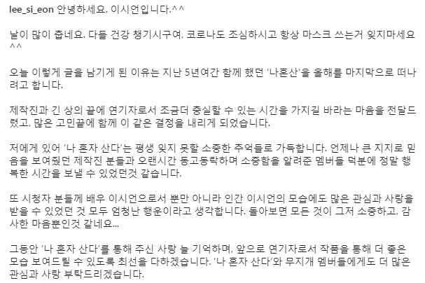 오늘 이렇게 글을 남기게 된 이유는 지난 5년여간 함께 했던 ‘나혼산’을 올해를 마지막으로 떠나려고 합니다.